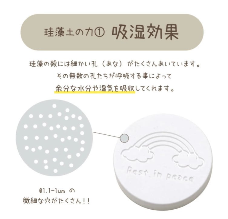 大事なペットちゃんの遺骨を守るために、骨壷に入れてお使いいただけるミニサイズの珪藻土です。 湿気を吸収してカビ菌が繁殖しずらい状態を保ってくれるほか、脱臭効果にも優れていますよ。